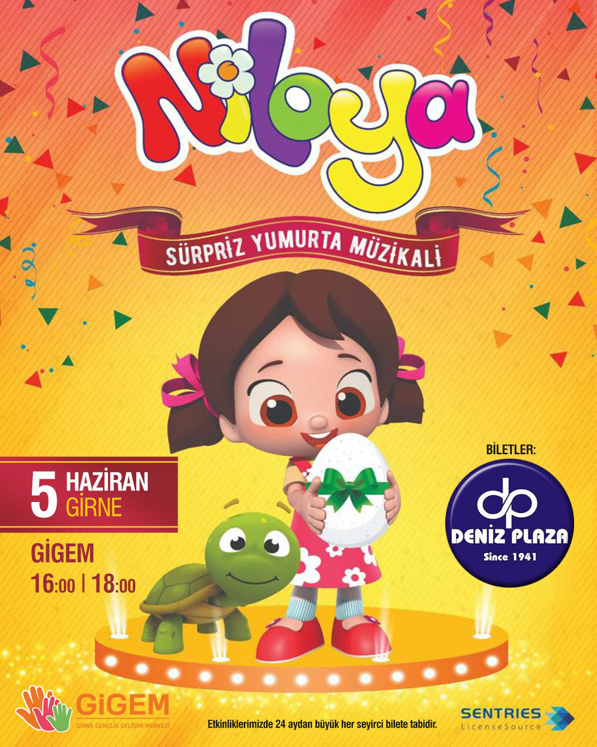 Girne Gençlik Gelişim Merkezi (GİGEM)’de 5 Haziran Pazar günü 15.00-20-00 saatleri arasında Niloya Süpriz Yumurta Müzikali ve beraberinde eğlenceli bir panayır gerçekleşiyor. Niloya Sürpriz Yumurta Müzikali’nin 16.00 ve 18.00 saatlerinde iki gösterim halinde sahne alacağı etkinlikte, panayır alanında yiyecek içecek stantları, oyun alanları ve çeşitli aktiviteler yer bulacak.