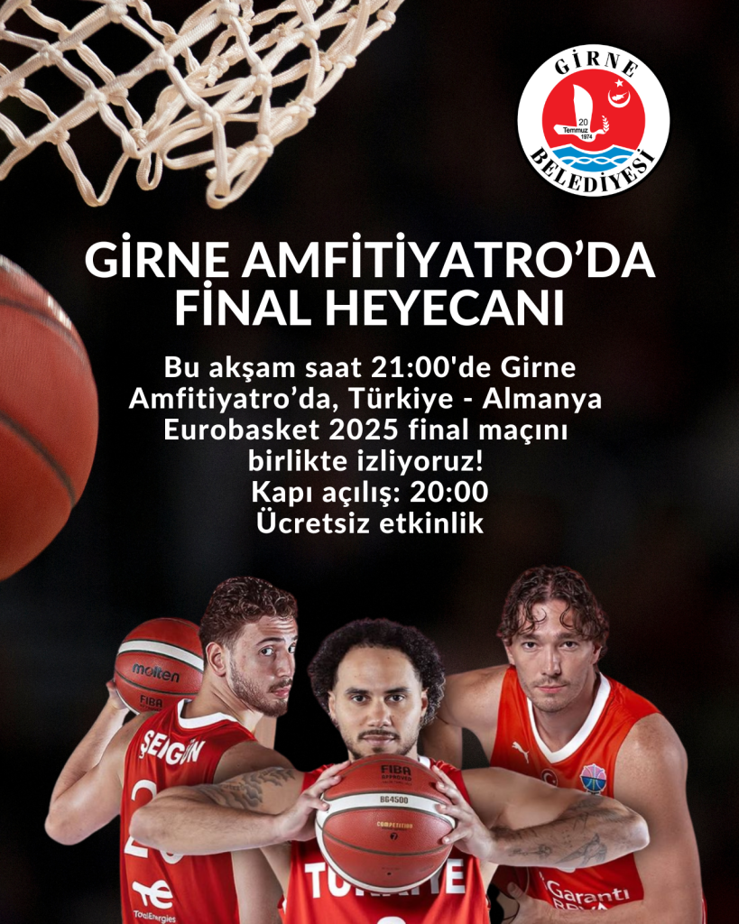 Girne Belediyesi, basketbol tutkunlarını unutulmaz bir geceye davet ediyor. Bu akşam saat 21.00’de, Türkiye ile Almanya arasında oynanacak olan Eurobasket 2025 final maçı, dev ekranda Girne Amfi Tiyatro’da basketbolseverlerle buluşacak.