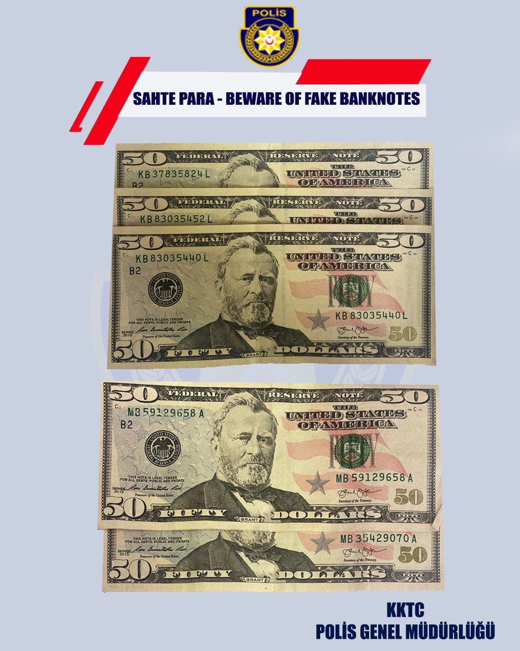 08.10.2022 tarihinde, saat 20:30 sıralarında, Girne’de faaliyet gösteren bir otel içerisinde bulunan E.B.(E-32)’nin üzerinde polis tarafından yapılan aramada; MB35429070A ve MB59129658A seri numaralarını içeren ve sahte olduğuna inanılan 2 adet 50’lik ABD doları, olayla bağlantısı olduğu tespit edilen V.T.(E-41)’nin kalmakta olduğu ikametgahta yapılan aramada ise KB83035452L, KB83035440L ve KB37835824L seri numaralarını içeren sahte olduğuna inanılan 3 adet 50’lik ABD doları para bulunarak emare olarak alınmıştır.