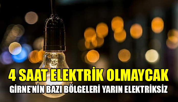 Kıbrıs Türk Elektrik Kurumu Girne Bölge Amirliği’nden verilen bilgiye göre, Beylerbeyi ve Çevresi, Beylerbeyi Su Pompaları, Muhabere Bölüğü ve Çevresi, ESK ve Bölgesi, Ozanköy Mezarlık Bölgesi’ne 9.00-13:00 saatleri arasında elektrik verilemeyecek.