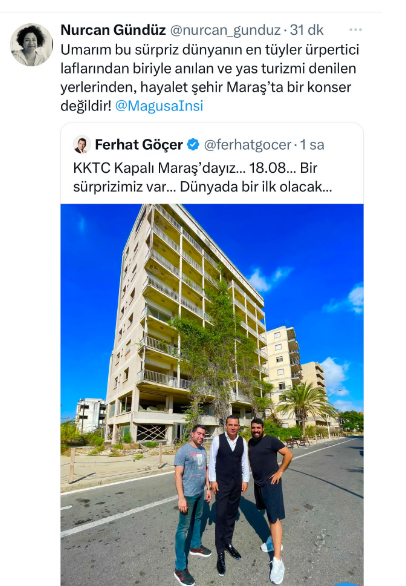 Mağusa’da Kapalı Maraş içerisinden resim paylaşarak, “ 18:08’de sizlere bir sürprizim var” notunu ileten sanatçı Ferhat Göçer’e sosyal medyadan tepki yağdı.