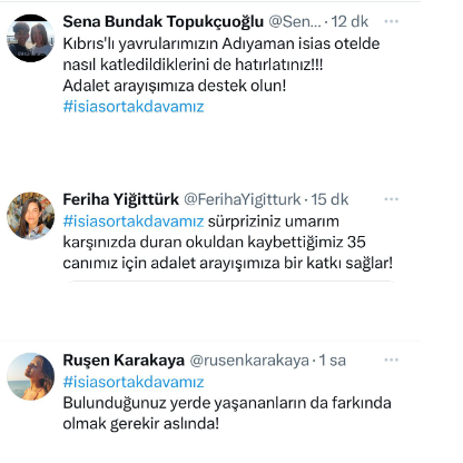 #isiasortakdavamız etiketi ile mesajlarını paylaşan aileler, “Tam karşıda bulunan okulda 36 kişi yaşamını yitirdi. Mağusa’ya verilecek en büyük müjde İSİAS katillerinin en ağır şekilde cezalandırılmasıdır” denildi.
