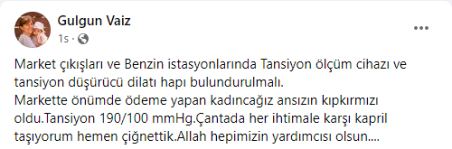 “Market çıkışları ve Benzin istasyonlarında tansiyon ölçüm cihazı ve tansiyon düşürücü dilaltı hapı bulundurulmalı” diyen Vaiz, “Markette önümde ödeme yapan kadıncağız ansızın kıpkırmızı oldu. Tansiyon 190/100 mmHg… Çantada her ihtimale karşı kapril taşıyorum hemen çiğnettik. Allah hepimizin yardımcısı olsun….” ifadelerini kullandı.