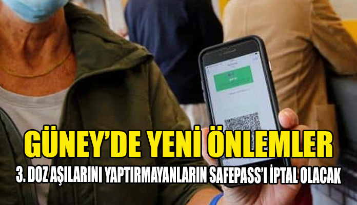 Güney Kıbrıs’ta artan koronavirüs vakalarına karşı yeni önlemler alındı. Maske kullanma zorunluluğu ve Safepass ibrazında yaş sınırı 6’ya indirildi. Üçüncü doz aşısını yaptırmayanların Safepass’ı 18 Aralık’tan itibaren iptal olacak.