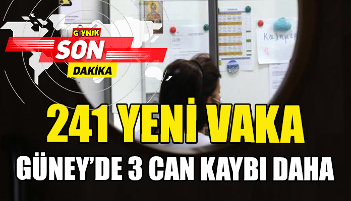 Kıbrıs Rum Sağlık Bakanlığı'ndan yapılan açıklamaya göre, Kıbrıs'ın güneyinde son 24 saatte yapılan 10 bin 328 test sonucunda 241 yeni pozitif vaka tespit edildi. 3 kişi hayatını kaybetti