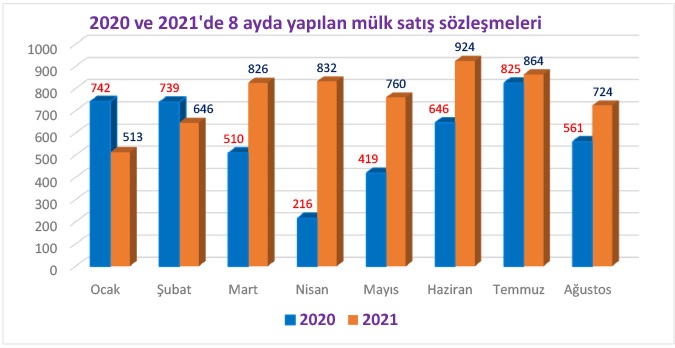 Geçen yılın Ağustos ayında 561 sözleşmeye kıyasla %29’luk bir artış söz konusu. Ancak, bu artışa rağmen emlak satış sayısı Ağustos 2019’daki 788 satışla karşılaştırıldığında, emlak satışlarının henüz COVID-19 öncesi seviyelere ulaşmadığı görülüyor.