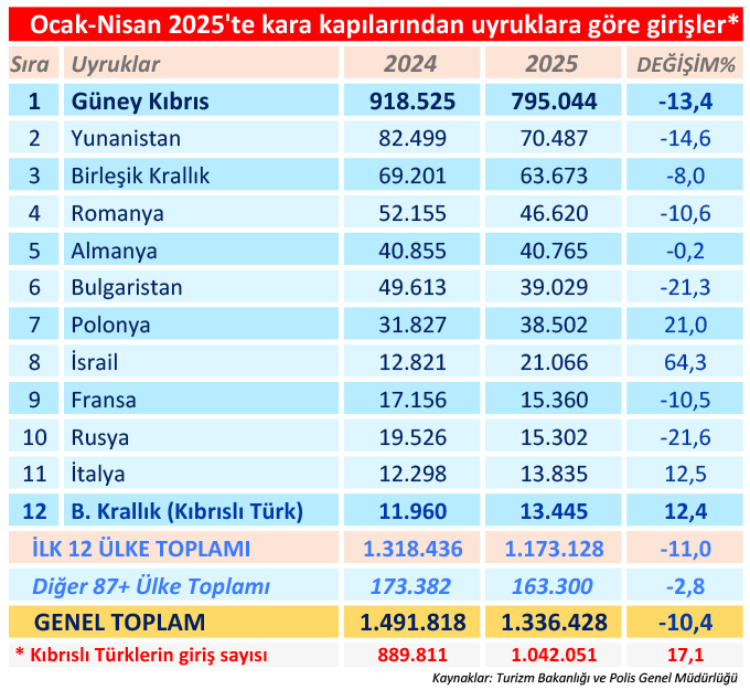 Turizm Bakanlığı’nın Polis Genel Müdürlüğü’nden sağladığı veriler, ilk dört aylık dönemde kara kapılarını kullanarak gelen Kıbrıslı Rumlar ile “yabancıların” sayısında 2024’ün aynı dönemine göre %10.4’lük sert düşüş olduğunu gösteriyor. 2024’te 1 milyon 491 bin 818 olan giriş sayısı 1 milyon 336 bin 428’e geriledi. Kıbrıslı Türkler (1.042.051) hesaplamaya katıldığı zaman ise düşüş oranı %0.20’ye iniyor.