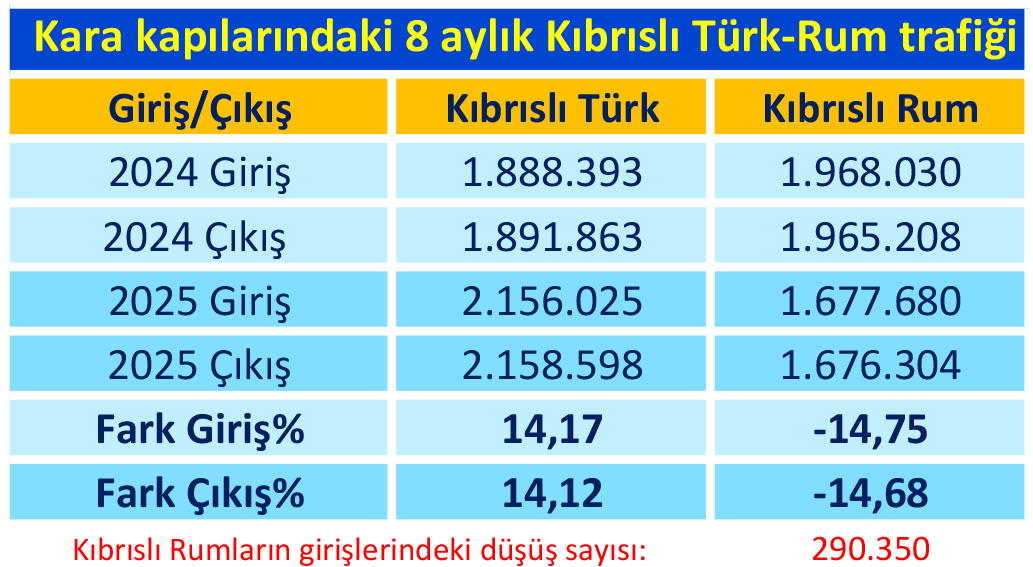 Kuzey Kıbrıs’a 2025’in 8 aylık döneminde kara kapılarından günde 21 bin 170 civarında giriş olduğu hesaplandı. Ocak-Ağustos periyodunda Kuzey Kıbrıs ile Güney Kıbrıs arasındaki 9 kapıyı kullanarak gelenlerin yaptıkları toplam giriş sayısı 5 milyon 144 bin 332 düzeyinde açıklandı. Bu girişlerin 2 milyon 156’sını Kıbrıslı Türkler sağlarken, geriye kalan 2 milyon 988 bin 307 girişi Kıbrıslı Rumlar ve Üçüncü ülkelerden gelenler oluşturdu.