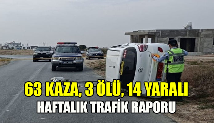 Polis Genel Müdürlüğü tarafından yayımlanan Haftalık Trafik Raporu’na göre, 15 – 21 Kasım 2021 tarihlerini kapsayan süre içerisinde, KKTC’de toplam 63 trafik kazası meydana geldi; 3 kişi hayatını kaybetti, 14 kişi ise yaralandı.