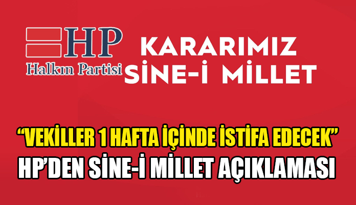 HP’den yapılan açıklamada, “Halkın Partisi, Parti Meclisi parti ilkelerini dikkate alarak bugün itibarıyla sine-i millet kararı almıştır. Buna uygun olarak Halkın Partisi milletvekilleri bir hafta içerisinde milletvekilliklerinden istifa edecekler ve bir yandan ana muhalefet partisi, Meclis dışı siyasi partiler, sendika, sivil toplum örgütleri ve meslek kuruluşlarıyla, diğer yandan da bölgelerde toplumun farklı kesimleriyle istişarelerde bulunacaklardır” ifadelerine yer verildi.