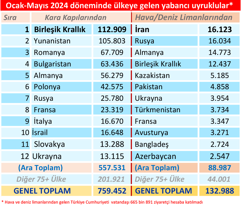 Kuzey Kıbrıs’a Ocak-Mayıs 2024 arasındaki dönemde “KKTC vatandaşı olmayan” 2 milyon 734 bin 114 kişinin giriş yaptığı saptandı. Hava ve deniz limanlarından gelenlerin çok büyük bir bölümünü Türkiye Cumhuriyeti vatandaşları; kara kapılarından gelenlerin çok büyük bir bölümünü ise Güney Kıbrıs Rum Yönetimi (Kıbrıs Cumhuriyeti) vatandaşları oluşturdu. Kıbrıslı Rumlar’ın geçişleri hesaplanmazsa, 5 aylık sürede Kuzey Kıbrıs’ı ziyaret eden yabancı sayısının 1 milyon 588 bin 331 olduğu ortaya çıkıyor. Söz konusu periyotta gelen 665 bin 891 TC vatandaşı haricinde, KKTC’ye gelen “üçüncü ülke uyruklu yabancı” sayısı ise 892 bin 440 düzeyinde hesaplandı.