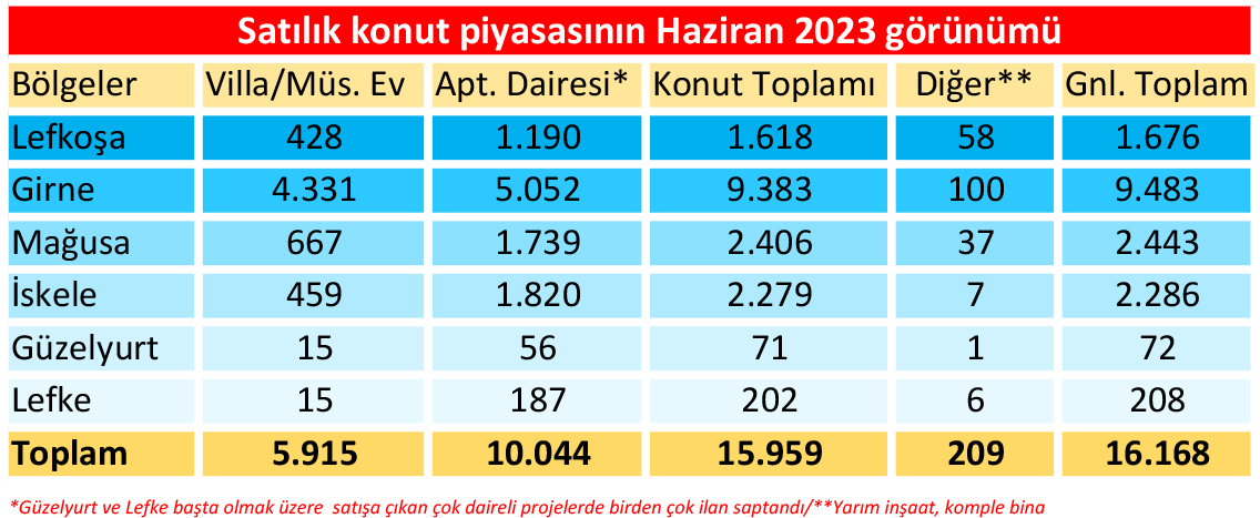 Kuzey Kıbrıs’ta Temmuz sonu itibarıyla satılık konut sayısı Haziran ayına kıyasla %4.21 oranında arttı. Haziran bitiminde 15 bin 315 olan satılık konut sayısı Haziran’da 655 adet artarak 15 bin 959’a çıktı. Satıştaki “diğer” konutlar (yarım inşaat, metruk bina ve komple bina) da hesaba katılırsa piyasada yeni sahibini bekleyen konut sayısı 16 bin 168’e yükseliyor. Piyasadaki villa ve müstakil evlerin payı %36.6; apartman dairelerinin payı %62.12; “diğer” konutların payı da %1.29 oranında hesaplandı.