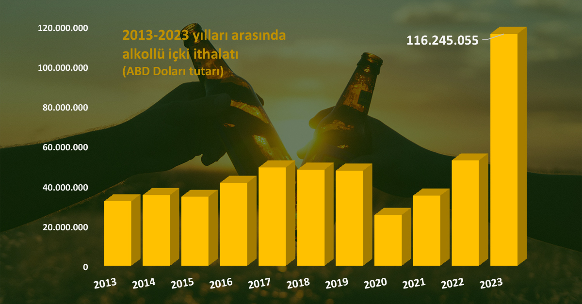 Ticaret Dairesi verileri 2023 yılında ülkeye 116 milyon 245 bin 054 dolarlık alkollü içki ithalatı yapıldığını gösteriyor. Daire, ithalatın Türk Lirası karşılığını 3 milyar 532 milyon olarak bildirdi ancak, içkinin “litre” bazındaki verisini açıklamadı. 2022 yılında 52,8 milyon dolarlık içki ithalatının bir yıl sonra ikiye katlandığı (yüzde 120 arttı) dikkati çekerken, önceki yıl ithal edilen 15 milyon 306 bin litrelik miktarın da aynı oranda arttığı ve 30 milyon litrenin geçildiği tahmin ediliyor.