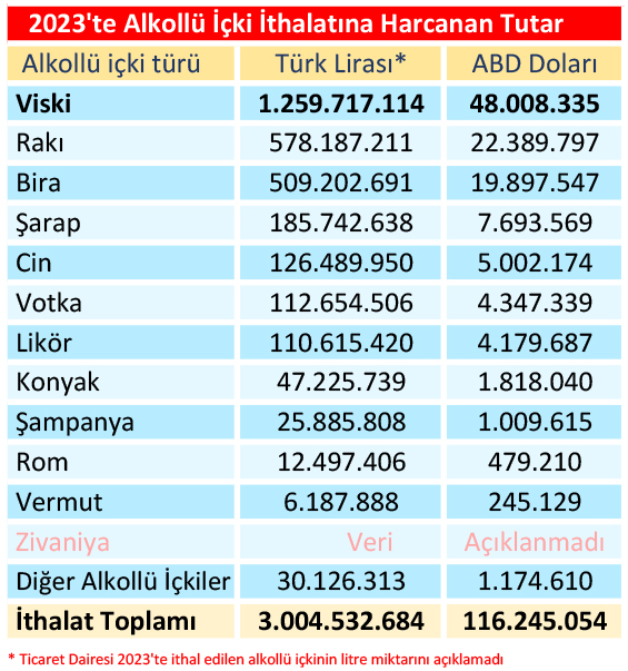 Ticaret Dairesi verileri 2023 yılında ülkeye 116 milyon 245 bin 054 dolarlık alkollü içki ithalatı yapıldığını gösteriyor. Daire, ithalatın Türk Lirası karşılığını 3 milyar 532 milyon olarak bildirdi ancak, içkinin “litre” bazındaki verisini açıklamadı. 2022 yılında 52,8 milyon dolarlık içki ithalatının bir yıl sonra ikiye katlandığı (yüzde 120 arttı) dikkati çekerken, önceki yıl ithal edilen 15 milyon 306 bin litrelik miktarın da aynı oranda arttığı ve 30 milyon litrenin geçildiği tahmin ediliyor.