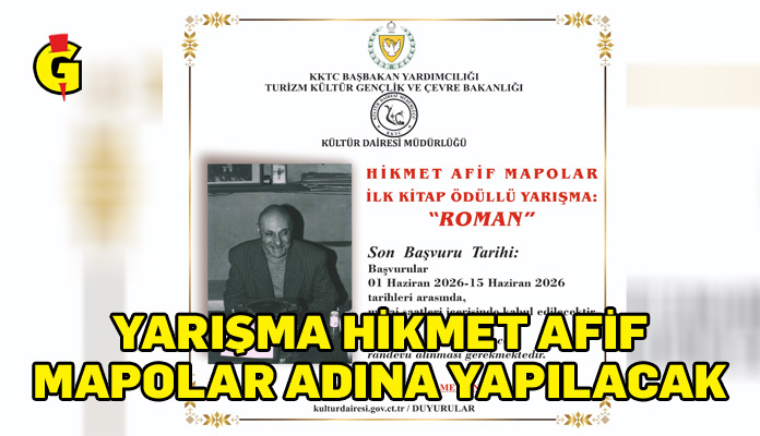 KKTC Başbakan Yardımcılığı, Turizm, Kültür, Gençlik ve Çevre Bakanlığı’na bağlı Kültür Dairesi tarafından düzenlenen Hikmet Afif Mapolar İlk Kitap Ödüllü Yarışma’nın başvuruları 1-15 Haziran 2026 tarihleri arasında kabul edilecek.