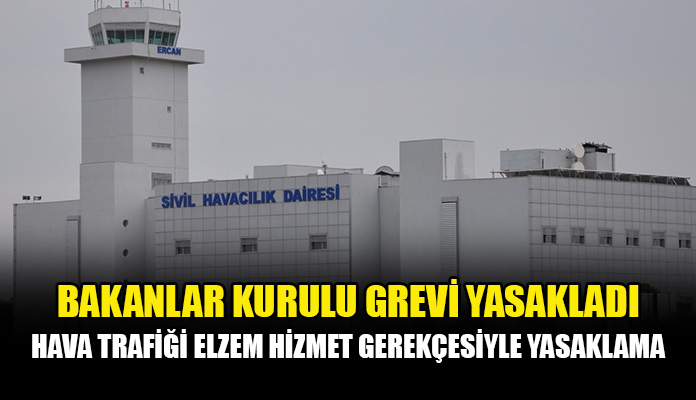 Hava Trafik Kontrolörleri Sendikası’nın (HTKS), Ercan Havalimanı’nın Hava Trafik Kontrol Merkezi’nde yarın 09.00’dan Pazar saat 08.00’e kadar yapacağını açıkladığı grev, Bakanlar Kurulu’nca yasaklandı.