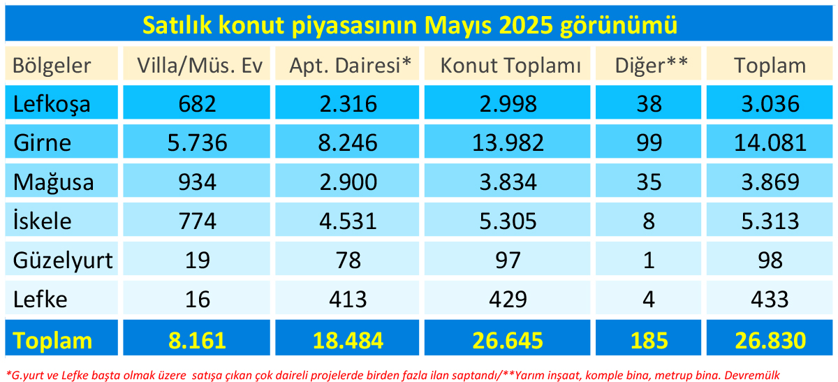 KKTC’de 11 Mayıs ayı itibarıyla satılık konut sayısı Mayıs 2024’e kıyasla %17 oranında arttı. Geçen yılın Mayıs ayında 22 bin 978 olan piyasadaki satılık konut ilanları sayısının 26 bin 830’a yükseldiği görüldü. Emlak çevreleri önümüzdeki aylarda tamamlanacak projelerle en az 2 bin evin daha piyasaya düşeceğini söylüyor. Satılık konutların yarısından fazlası Girne’de. Emlak başkentinin ardından İskele geliyor. Ülkenin altı ilçesinde 18 bin 484 adet satılık apartman dairesi, stüdyo daire ve penthouse ilanı saptandı. Yaptığımız araştırmada 8 bin 161 villa, ikiz villa ve müstakil konut ilanı, 185 adet de satılığa konan yarım inşaat, komple bina, devremülk ve metruk bina var.