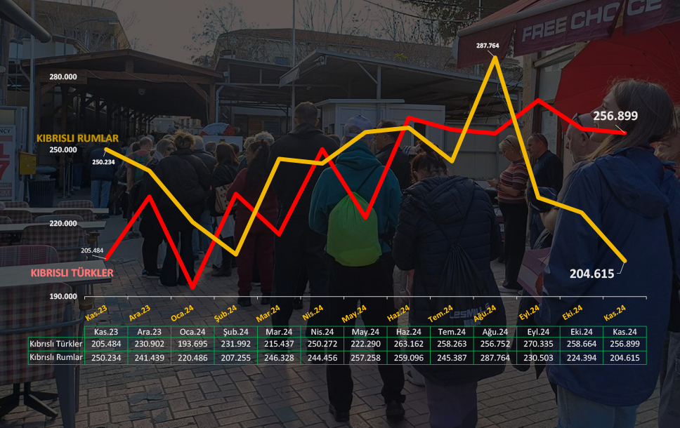 Kasım 2023 (aylık sürede) 250 binden fazla Rum Kuzey’e geçerken Kasım 2024’te bu sayı 205 bine düştü