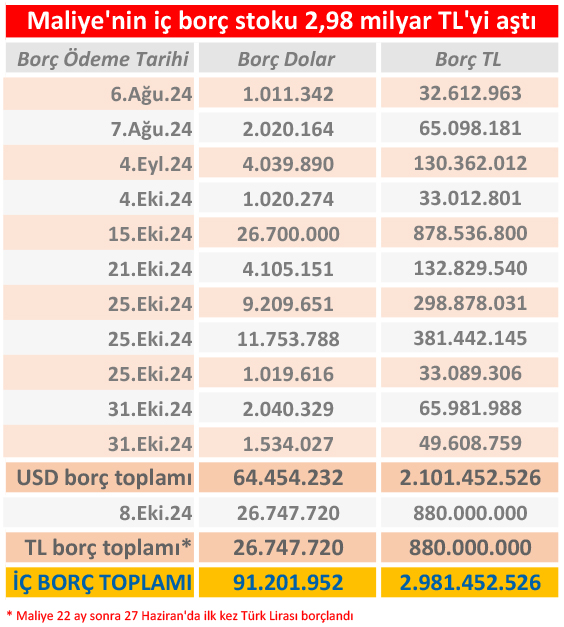 Maliye Bakanlığı 2024 yılının ilk yarısında bütçe ihtiyaçları ve bazı kurumların kısa vadeli finansman ihtiyacı için toplam 104 milyon 338 bin ABD Doları (3 milyar 386 milyon TL) TL iç borç aldı. Yapılan borç geri ödemeleri sonrasında 31 Temmuz itibarıyla Maliye’nin iç borç stoku “91 milyon 202 bin dolar” (2 milyar 983 milyon) seviyesinde görülüyor. KKTC Merkez Bankası verilerine göre; Yılın ilk yarısında bütçe ihtiyaçları için sadece iki ayrı ihalede 26,7 milyon doları ve 880 milyon TL borç alındı. Maliye’nin “maaşları ödeyebilmek” için 22 ay sonra yüzde 60’ı aşan faizle Türk Lirası borç alması dikkati çekti. Merkez Bankası’nın Maliye’ye kullandırdığı Kısa Vadeli Avans (KVA) miktarının hangi düzeyde olduğu ise bilinmiyor.