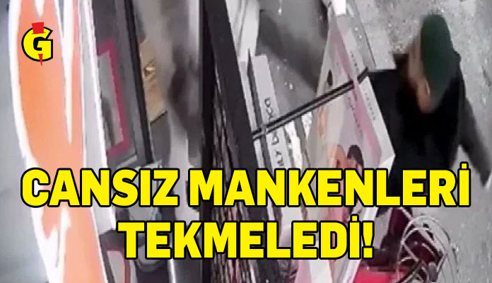 Saldırgan, kadın iç çamaşırı giydirilen cansız mankenleri tekmeleyerek yere düşürdü.