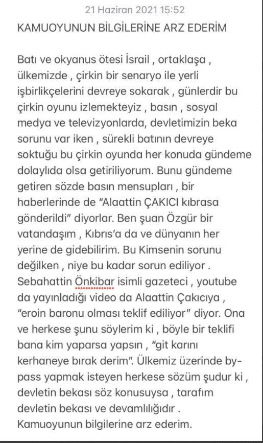 Alaattin Çakıcı, sosyal medya paylaşımında “ben şu an özgür bir vatandaşım. Kıbrıs’a da dünyanın her yerine de gidebilirim. Bu kimsenin sorunu değilken niye bu kadar sorun ediliyor” ifadelerini kullandı.