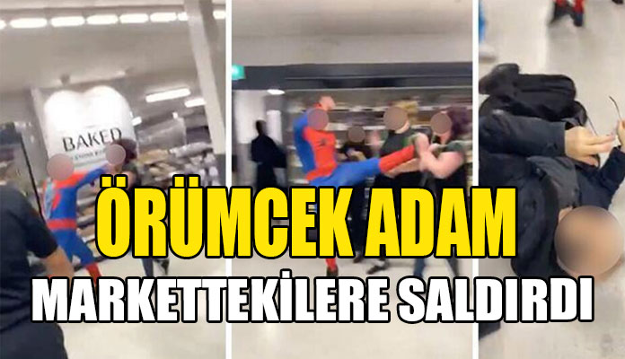 Görüntülerde, örümcek adam kostümlü kişinin bir kadına tekme ve yumruk atarak saldırdığı ve süpermarketin depo alanında market çalışanları ile şüpheliler arasında arbede yaşandığı görüldü.