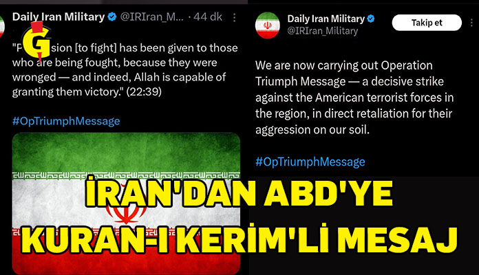 İran İslam Cumhuriyeti Silahlı Kuvvetleri sosyal medya hesaplarından biri olan “Daily Iran Military”, sosyal medya platformu X üzerinden yaptığı paylaşımlarda, Amerika Birleşik Devletleri’ne karşı “Zafer Mesajı Operasyonu” adı verilen askeri bir karşılık başlatıldığını duyurdu.