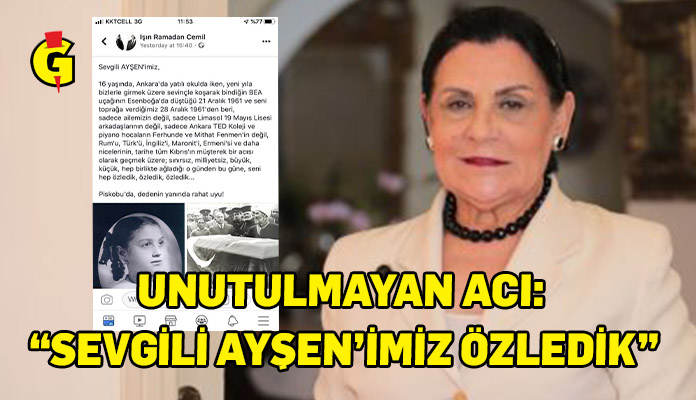 16 yaşında, Ankara’da yatılı okulda iken, yeni yıla bizlerle girmek üzere sevinçle koşarak bindiğin BEA uçağının Esenboğa’da düştüğü 21 Aralık 1961 ve seni toprağa verdiğimiz 28 Aralık 1961’den beri, sadece ailemizin değil, sadece Limasol 19 Mayıs Lisesi arkadaşlarının değil, sadece Ankara TED Koleji ve piyano hocaların Ferhunde ve Mithat Fenmen’in değil, Rum’u, Türk’ü, İngiliz’i, Maronit’i, Ermeni’si ve daha nicelerinin, tarihe tüm Kıbrıs’ın müşterek bir acısı olarak geçmek üzere; sınırsız, milliyetsiz, büyük, küçük, hep birlikte ağladığı o günden bu güne, seni hep özledik, özledik, özledik…