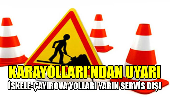 Karayolu Master Planı kapsamında yapım çalışmaları devam eden İskele – Çayırova bölünmüş anayolunda, Çayırova kavşağında yapılacak çalışmalardan dolayı bugün (7 Kasım 2021 Pazar) saat 06:00 ile akşam saat 6:00 arasında trafik akışı kontrollü olarak servis yollarından sağlanacak.