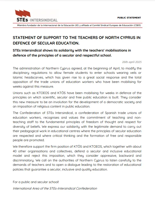 İspanya’da eğitim çalışanlarını temsil eden STEs Intersindical Konfederasyonu, başörtüsünü okullarda serbest bırakan disiplin tüzüğü değişikliğine karşı sürdürülen sendikal eylemlere destek belirtti.