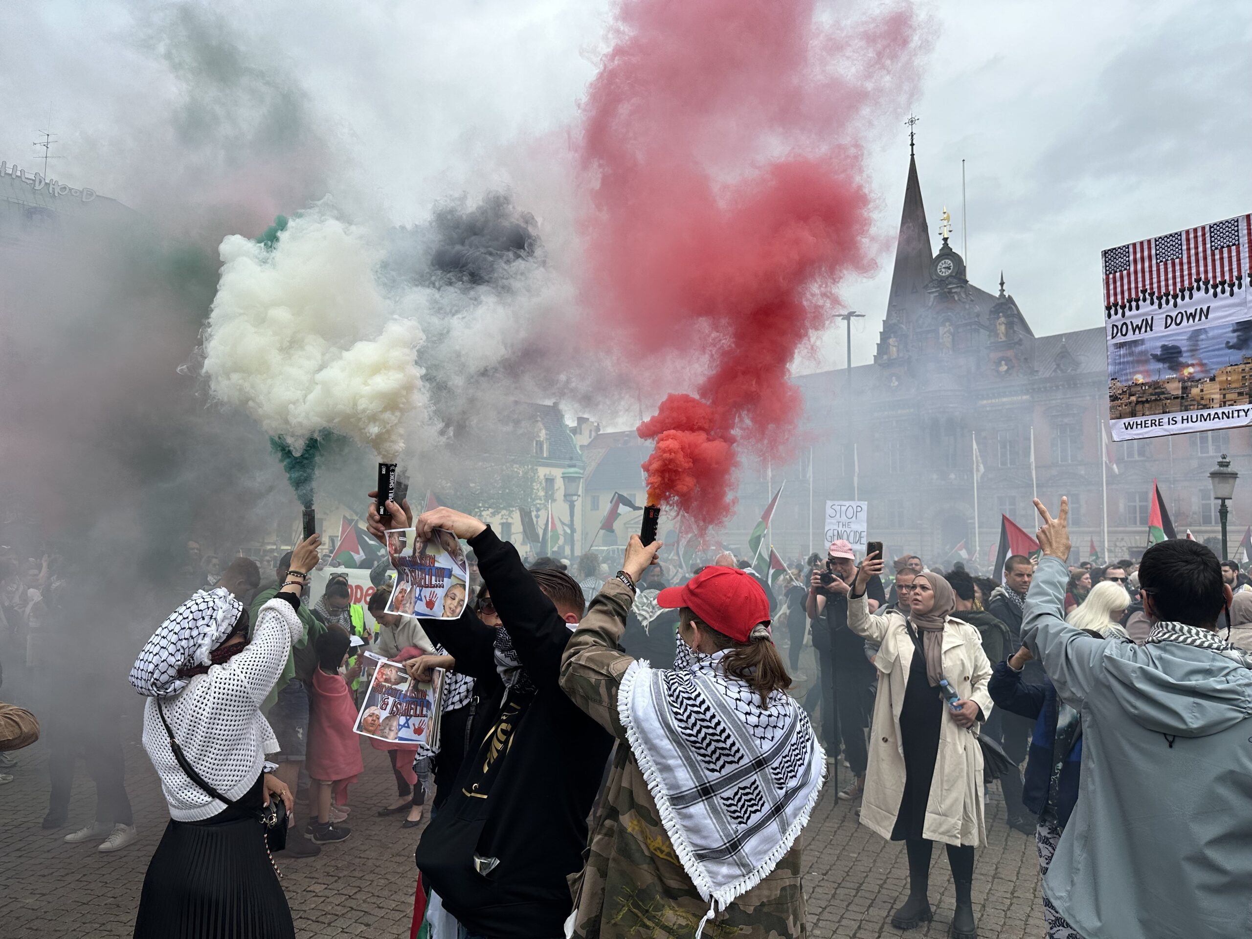 “Filistin’e özgürlük”, “Soykırımcı İsrail”, “İsrail’e boykot” sloganları atan göstericiler, Möllevangstorget Meydanı’na kadar yürüdü.