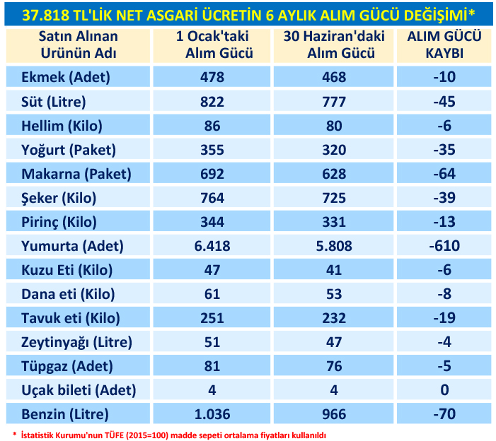 Öte yandan, İstatistik Kurumu’nun resmi rakamları asgari ücretin Ocak ayıdaki alım gücü ile Haziran ayıdaki alım gücü arasında ciddi bir fark oluştuğuna işaret ediyor. Bazı örnek verilere göre; Ocak’ta bin 036 litre benzin alan bir kişi artık 966 litreyle yetinmek zorunda. Fark yumurtada 610 adede; sütte 45 litreye; makarada 64 pakete; şekerde 39 kiloya; tavuk etinde 19, dana etinde 8, kuzu etinde 6 kiloya kadar düşüyor.