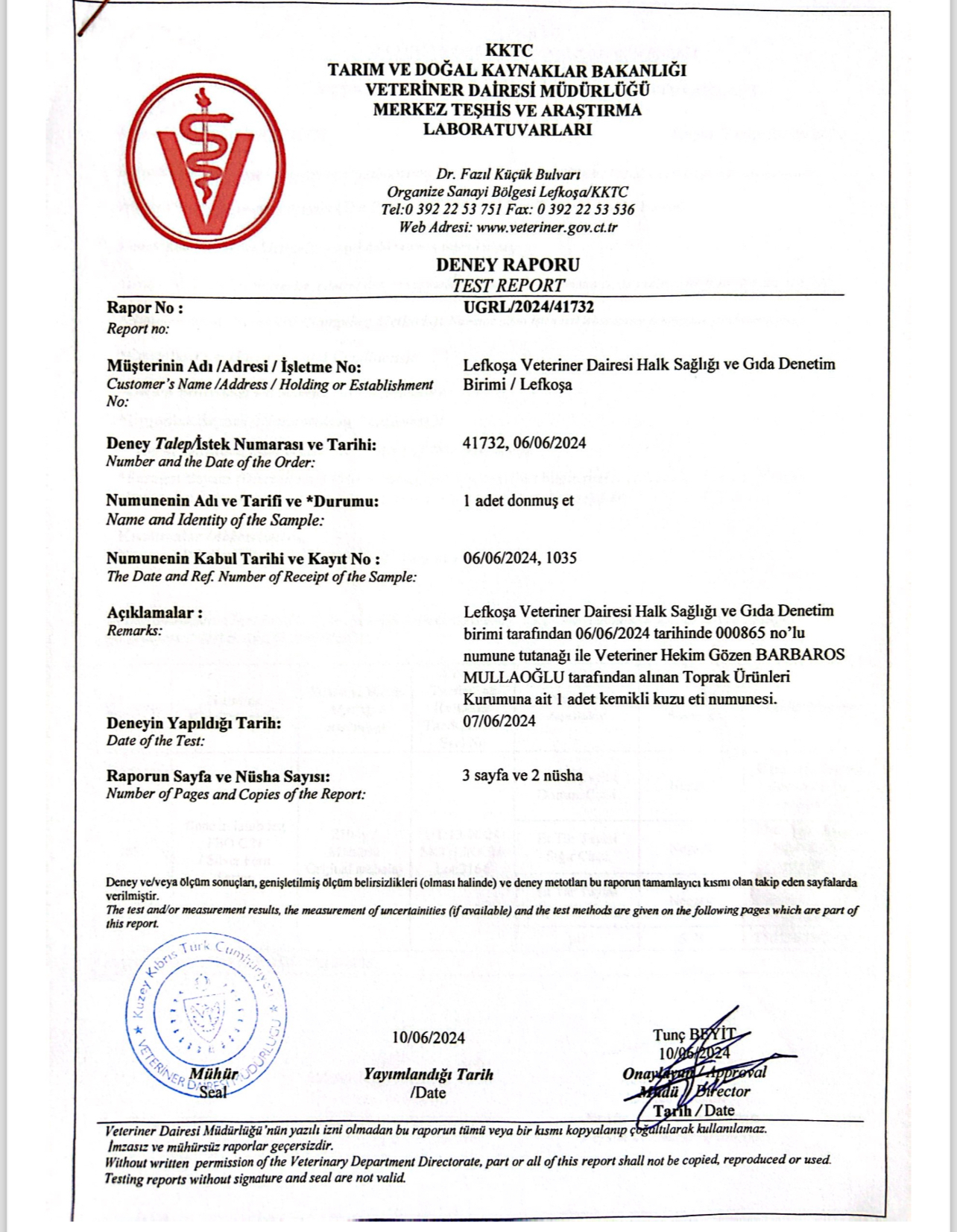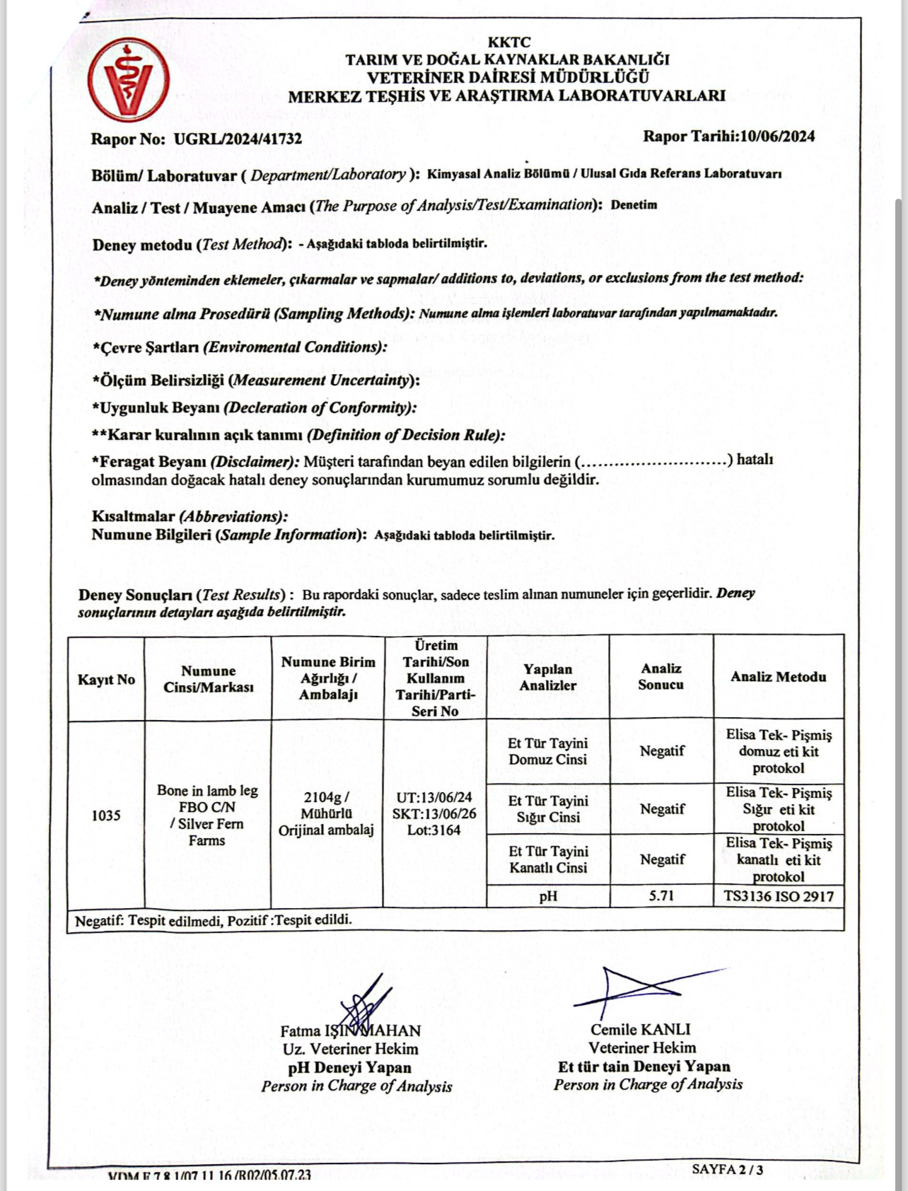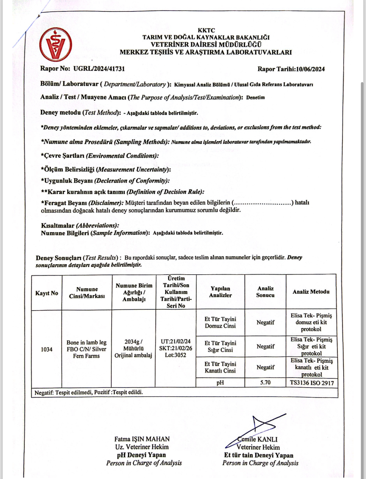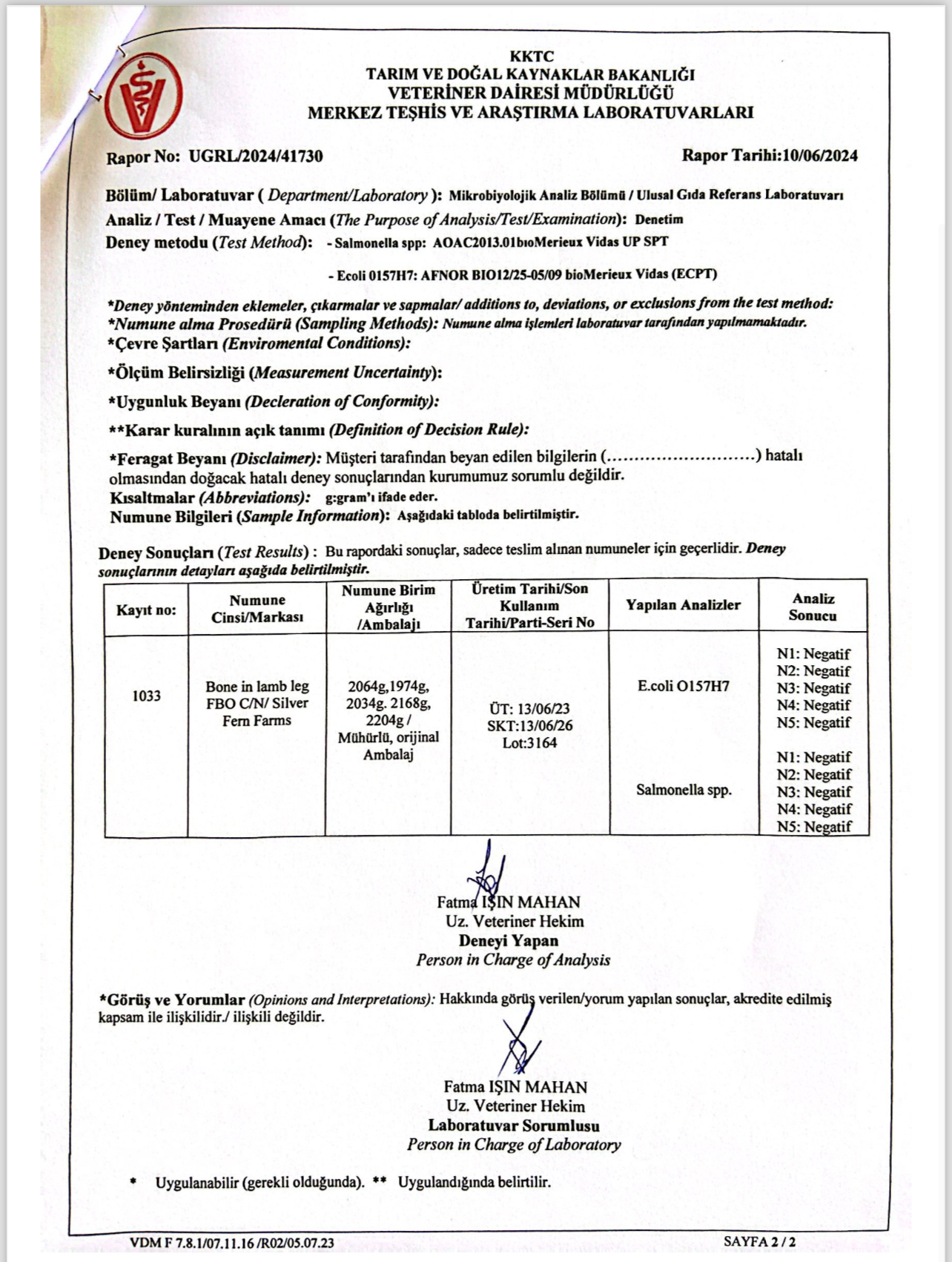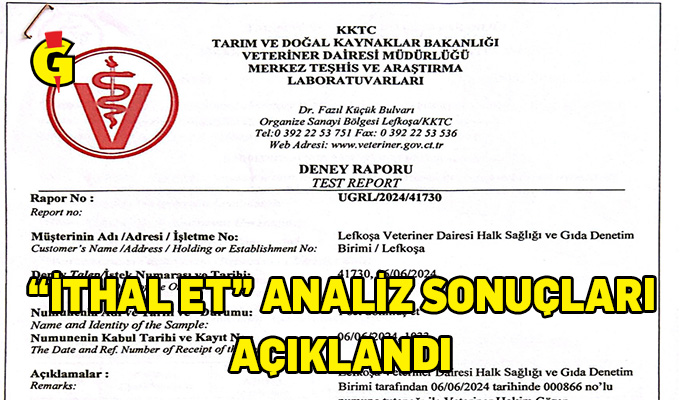 “Veteriner Dairesi Müdürlüğü’ne bağlı Resmi Veteriner Hekim tarafından yerinde fiziki ithalat muayenesi yapılan ürünlerin ülkeye girişi uygun bulunmuş, Veteriner Dairesi Müdürlüğü Halk Sağlığı Birimi tarafından talep edilen doğrulama analizlerinin sonuçları çıkıncaya kadar ürünün piyasaya arzı sağlanmamıştır. VDM Ulusal Gıda Referans Laboratuvarı tarafından yapılan ve ekte raporları sunulan mikrobiyolojik, kimyasal ve tür tayini analiz sonuçlarına göre söz konusu donmuş etlerin tüketilmesinde halk sağlığı açısından herhangi bir risk bulunmamaktadır.”