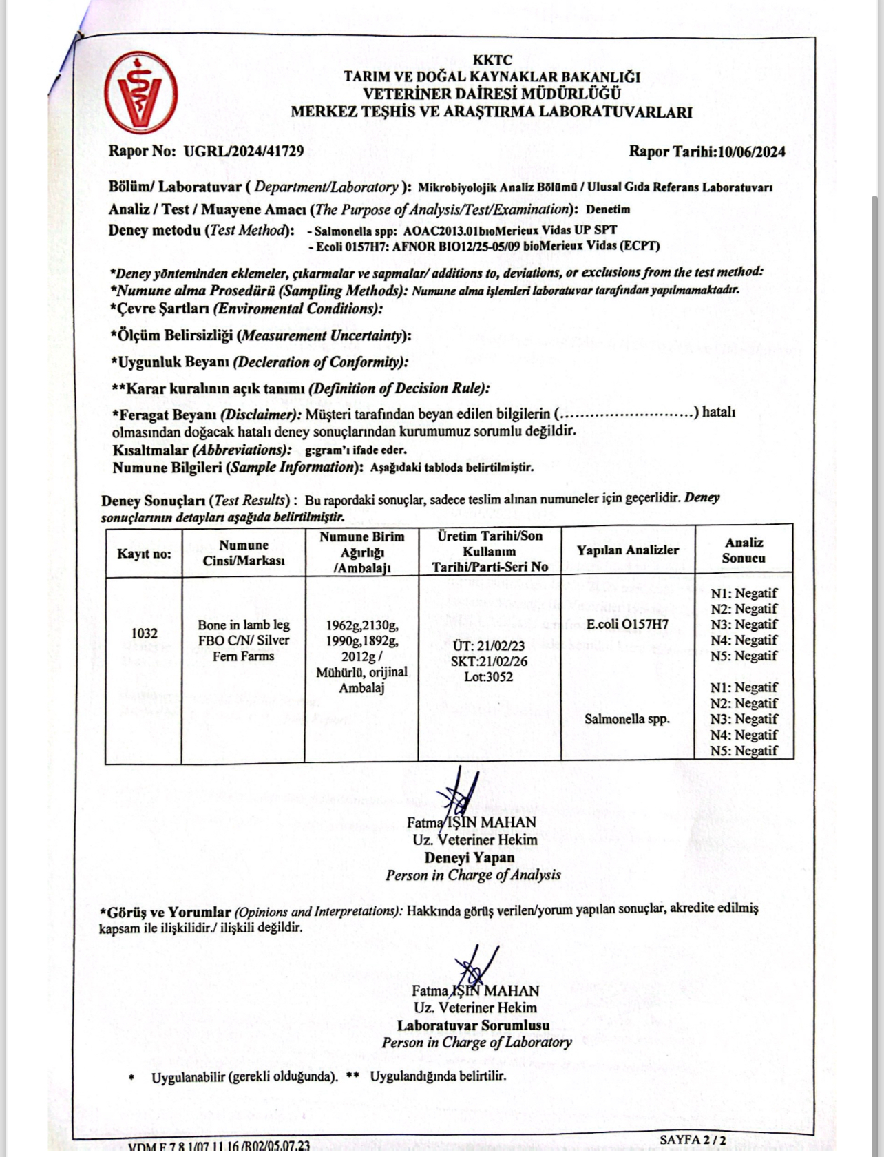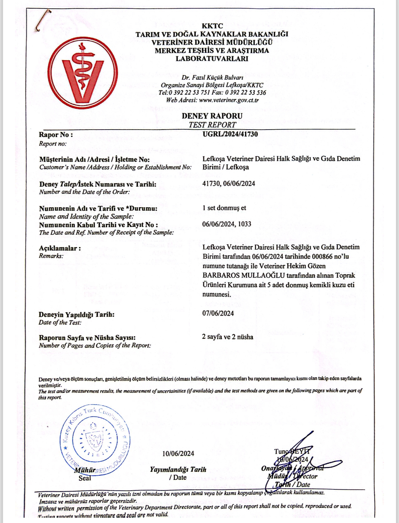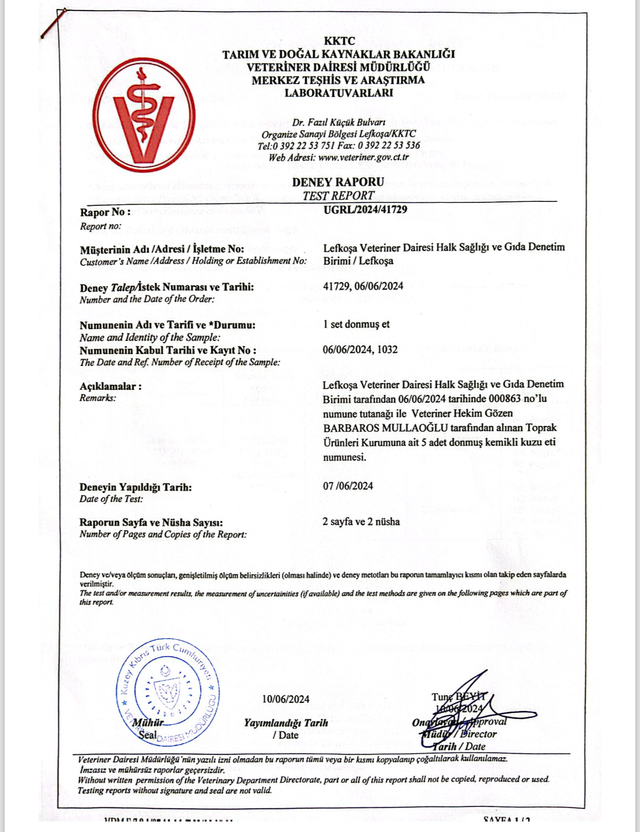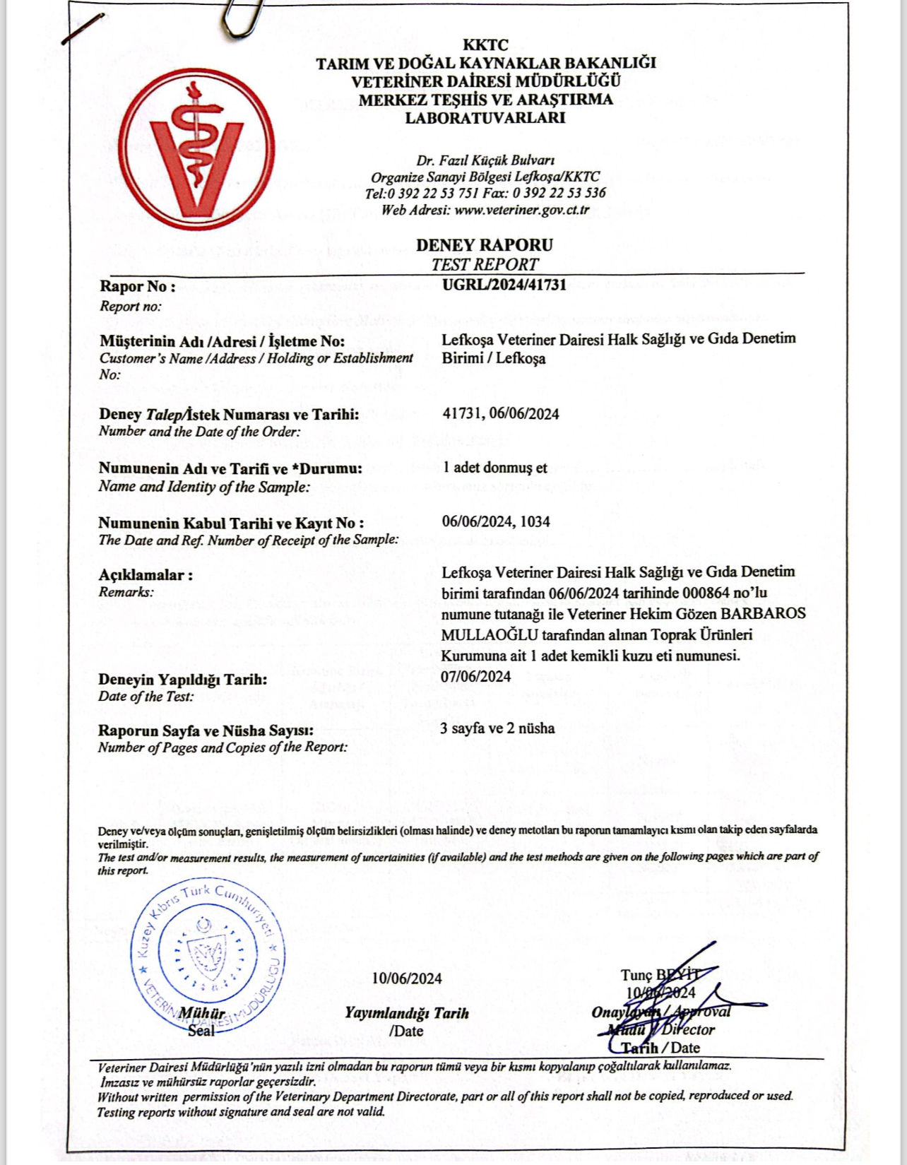 “Veteriner Dairesi Müdürlüğü’ne bağlı Resmi Veteriner Hekim tarafından yerinde fiziki ithalat muayenesi yapılan ürünlerin ülkeye girişi uygun bulunmuş, Veteriner Dairesi Müdürlüğü Halk Sağlığı Birimi tarafından talep edilen doğrulama analizlerinin sonuçları çıkıncaya kadar ürünün piyasaya arzı sağlanmamıştır. VDM Ulusal Gıda Referans Laboratuvarı tarafından yapılan ve ekte raporları sunulan mikrobiyolojik, kimyasal ve tür tayini analiz sonuçlarına göre söz konusu donmuş etlerin tüketilmesinde halk sağlığı açısından herhangi bir risk bulunmamaktadır.”
