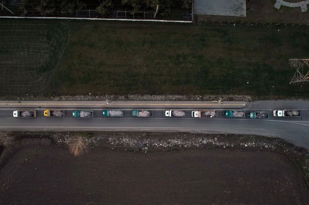 Kamyonların enkazı boşalttıkları alana giderken oluşturduğu metrelerce kuyruk, drone ile havadan görüntülendi.