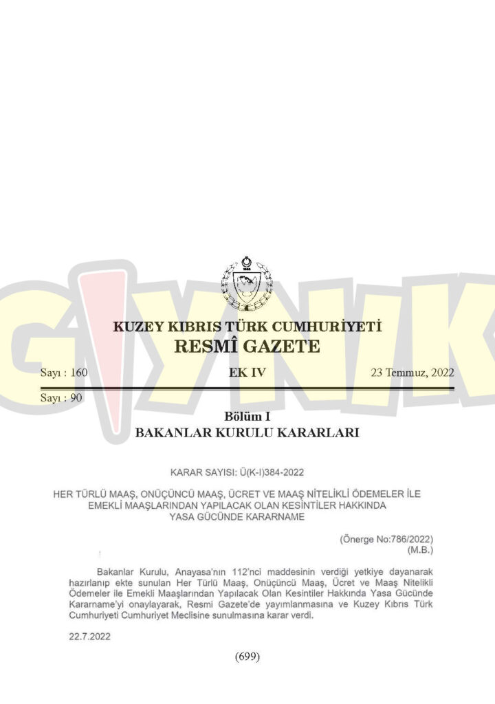 Hükümetin devlet çalışanları ve emeklilerin alacağı hayat pahalılığı ödeneğinden yapacağı kesintilerle ilgili hazırladığı kanun hükmünde kararname bu gece Resmi Gazete’de yayınlandı. Bakanlar Kurulu ayrıca Yasa Gücü’nde kararnameyi onaylanması için Cumhuriyet Meclisi’ne de sevk etti.