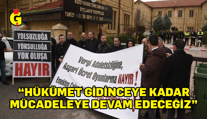 Lefkoşa Terminal Çemberi’nde toplanan Kıbrıs Türk Amme Memurları Sendikası (KTAMS), Kıbrıs Türk Kamu Görevlileri Sendikası (KAMUSEN), Kamu İşçileri Sendikası (KAMU-İŞ), Kıbrıs Türk Öğretmenler Sendikası (KTÖS) ve Kıbrıs Türk Orta Eğitim Öğretmenler Sendikası (KTOEÖS) yetkilileri, sloganlarla Başbakan Yardımcılığı, Turizm, Kültür, Gençlik ve Çevre Bakanlığı önüne yürüdü.