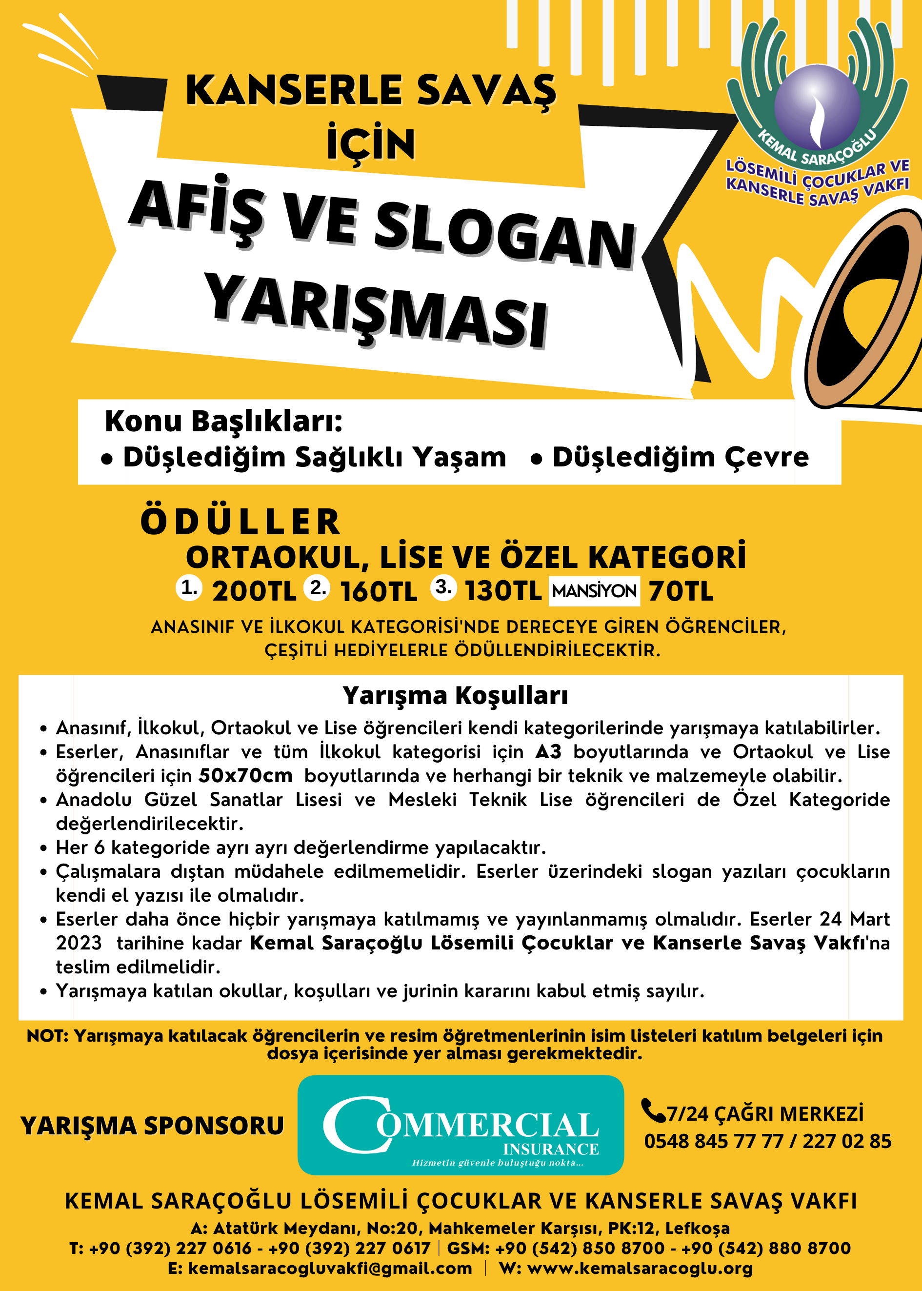 Bu yıl 20.’si yapılacak olan ve 6. kez Commercial Sigorta ana sponsorluğunda düzenlenecek Kanserle Savaş için Afiş ve Slogan Yarışması, tüm ana okul, İlköğretim, Ortaöğretim ve Meslek Liselerinde okuyan öğrencilere yönelik yapılacak.