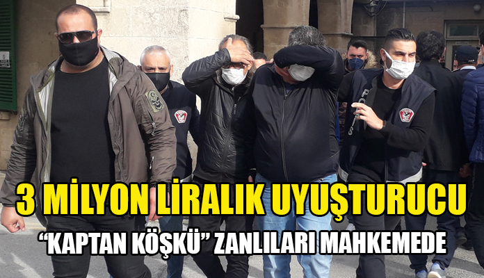 Narkotik Polisleri tarafdında gerçekleştirilen “Kaptan Köşkü” operasyonunda Girne Turizm Limanı’nda ele geçirilen 3 milyon liralık uyuşturucuyla ilgili tutuklanan zanlı 1 Akın Barut, zanlı 2 Ahmet Ünal, zanlı 3 Cihan ONGUN ve zanlı 4 Nihat Kürklü mahkeme huzuruna çıkarıldı.
