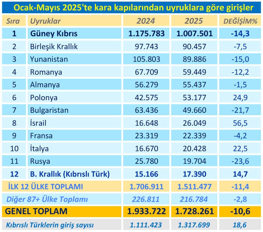 Kuzey Kıbrıs’a 2025’in ilk beş aylık döneminde günde 20 bini aşkın giriş olduğu hesaplandı. Turizm Bakanlığı verilerine göre, Ocak-Mayıs aylarında kara kapılarından yapılan giriş sayısı 3 milyon 045 bin 658 düzeyinde hesaplandı. Bu rakamlar kara kapılarında aşırı bir yoğunluğa işaret etmesine rağmen, Kıbrıslı Rumlar ile diğer ülkelerden gelenlerin sayısında geçen yıla kıyasla ciddi oranda düşüş olduğu dikkati çekiyor. Bu rakam geçen yıla kıyasla %10.6’lık (205 bin 461 geçiş) düşüşe işaret ediyor. Beş aylık dönemde Kıbrıslı Türkler haricinde yapılan girişler 1 milyon 728 bin 261 olarak kayıtlara geçti.