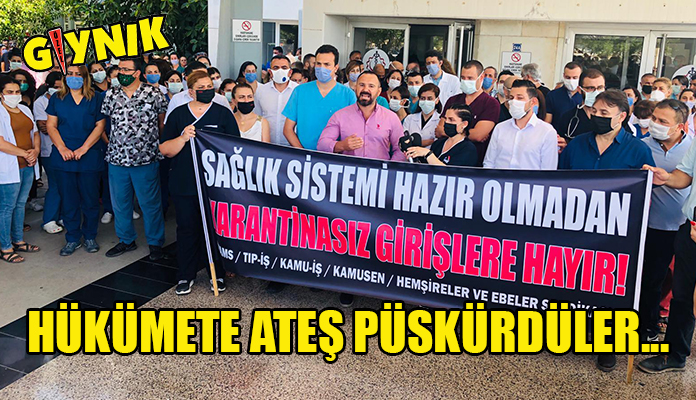Kıbrıs Türk Hemşireler ve Ebeler Sendikası Başkanı Ali Özgöçmen: “Bir ipte iki cambaz oynamaz ve bu pandeminin cambazları tüm sağlık çalışanlarıdır. Ya siz bu ipten inin ya da biz sizi indirmesinizi biliriz. Bizler açılmaya karşı değiliz, sadece hazırlıksız açılmaya karşıyız. Halk sağlık çalışanlarının ve bilimin yanındadır. Mevsimlik işçi adı altında, partizanca, seçim yatırımı amaçlı ve meslek onurumuzu ayaklar altına alarak hemşire istihdamı yapmaya çalışıyorlar, bizim de buna sessiz kalacağımızı düşünüyorlar. Pandemi hastanesi nerede, hemşire nerede, doktor nerede? Ya bunları çözün ya da çekin gidin. Eğer bilime, sağlık çalışanlarına kulak vermeyecekseniz, o zaman biz çıkalım bu hastaneden de siz gelin çalışın. Sağlık sistemimiz yeterli seviyeye getirilmeden karantinasız girişlere hayır diyoruz.”