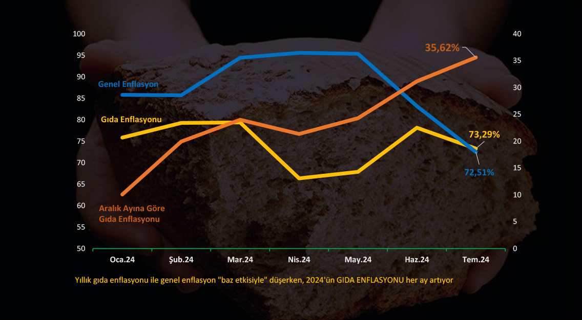 İstatistik Kurumu verilerine göre, temel gıda maddelerinden ekmeğin fiyatı Temmuz 2023-Temmuz 2024 periyodunda %58’lik fiyat şişmesi diğer gıdalarda da görülüyor. Temmuz 2024 sonuna göre bir yıllık periyotta Tüketici Fiyat Endeksi’nde kapsanan (TÜFE) “En Ağırlıklı 40 Madde” içinde yer alan gıdalardan yoğurtta yıllık bazda %106; kuzu eti pirzolada %88; suda (damacana) %84; dana eti kıymada %78; hellimde %77; uzun ömürlü sütte %65 ve temizlenmiş bütün tavukta da %45 oranında fiyat artışı saptandı.