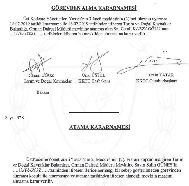 Orman Dairesi Müdürü Cemil Karzaoğlu görevden alındı. Karzaoğlu'nun yerine Salih Güneş atandı.