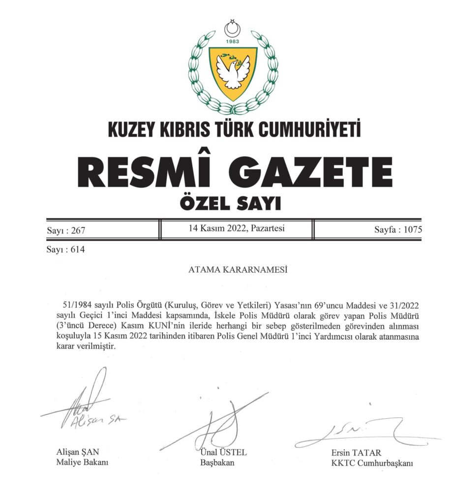 51/1984 sayılı Polis Örgütü (Kuruluş, Görev ve Yetkileri) Yasası’nın 69’uncu Maddesi ve 31/2022 sayılı Geçici 1 ‘inci Maddesi kapsamında, İskele Polis Müdürü olarak görev yapan Polis Müdürü (3 ‘üncü Derece) Kasım KUNİ’nin ileride herhangi bir sebep gösterilmeden görevinden alınması koşuluyla 15 Kasım 2022 tarihinden itibaren Polis Genel Müdürü 1 ‘inci Yardımcısı olarak atanmasına karar verilmiştir.