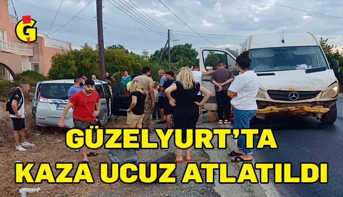 Polis Basın Subaylığı’ndan verilen bilgide, saat 19.00 sıralarında, Güzelyurt’ta Ramiz Turan Caddesi üzerinde, kuzey istikametine doğru seyreden Ahmet Hatay (E-21) yönetimindeki RE 139 plakalı Panelvan araç ile dikkatsizliği sonucu o esnada önünde aynı istikamete doğru seyreden ve yolun sağ kısmında bulunan toprak yola dönüş yapmak için yavaşlayan Hasan Sapsızoğlu (E-48) yönetimindeki YN 547 plakalı salon aracın arka kısmına çarptı. Kaza sonucu yaralanan her iki araç sürücüsü ve YN 547 plakalı araçtaki yolcu Salman Bebe (E-46), kaldırıldıkları Cengiz Topel Hastanesinde acil serviste müşahede altına alındı.