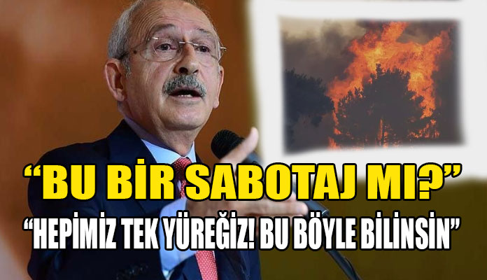 Türkiye’nin dört bir yanında peş peşe meydana gelen orman yangınlarına tepki gösteren CHP Genel Başkanı Kemal Kılıçdaroğlu, “Bu bir sabotaj mı, devlet bunu mutlaka tespit edecektir. Bu konuda hepimiz biriz; tek yüreğiz. Bu böyle bilinsin” dedi.