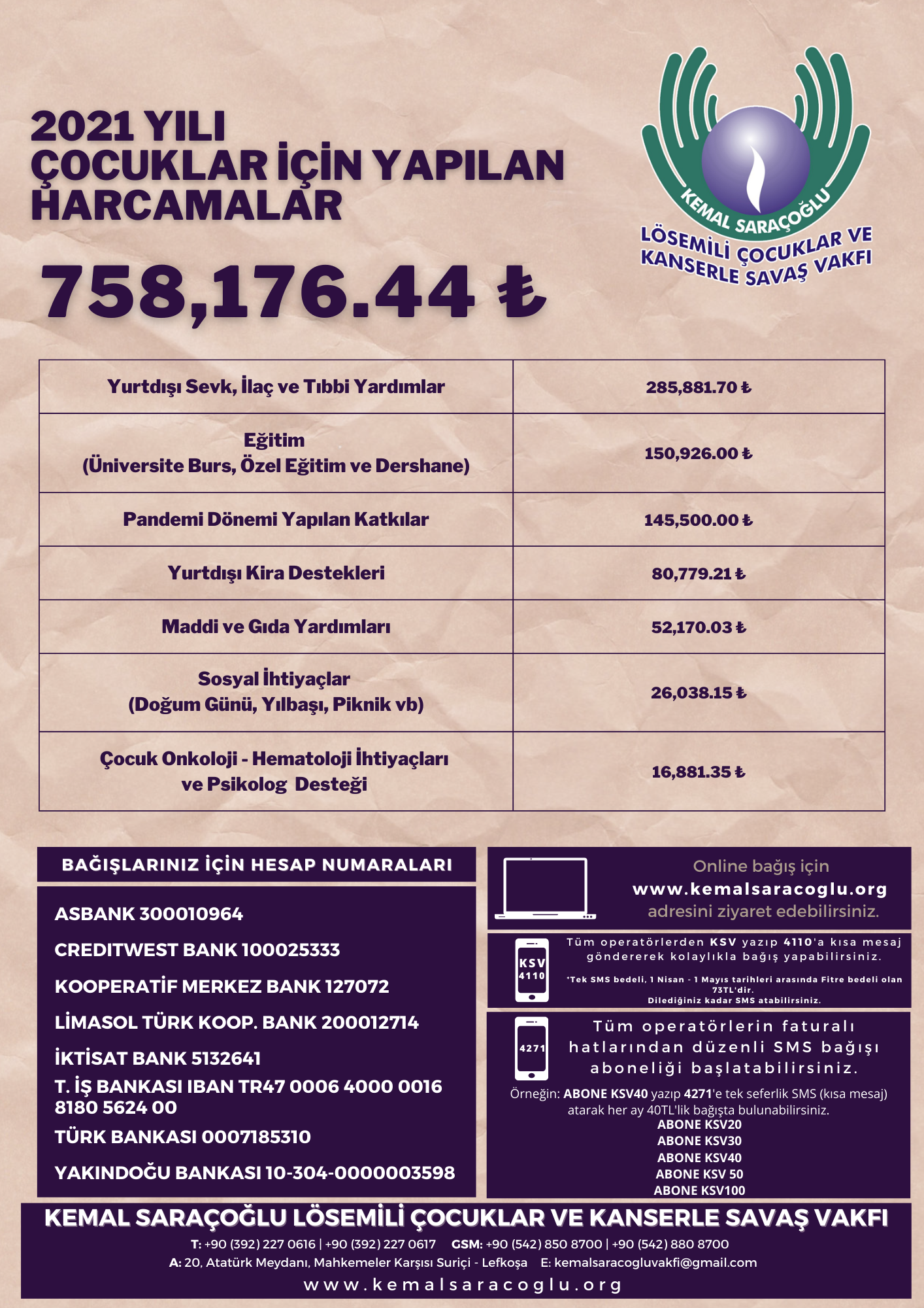 Kemal Saraçoğlu Vakfı’nın bir diğer büyük misyonu ise 0-21 yaş kanser teşhisi almış, çocuk ve ailelerine maddi ve manevi yardım sağlayabilmektir. Vakıf, çocuk ve ailelerinin tedavi, ilaç, gıda, maddi yardım, eğitim, sosyal ve psikolojik vb. gibi ihtiyaçlarını kişisel ve kurumsal bağışlarla yani sadece halktan gelen destekle sürdürebilmektedir. Şeffaflık konusunda oldukça hassas olan Kemal Saraçoğlu Vakfı, 2021 yılında çocuklar için 758.176,44TL harcama yapıldığını kamuoyu ile paylaşarak bağış yapan herkese sevgilerini ve teşekkürlerini göndermiştir. Kurum, kanser yolculuğundaki çocuk ve ailelerinin yaşadıkları sıkıntılara çözüm bulmak ve onlara destek olmak için çalışmalarını sürdürmekte ve yardımlarını devam ettirebilmek için sürekli olarak bağış desteğine ihtiyaç duymaktadır.