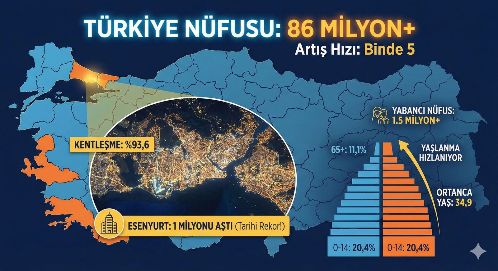 Veriler, Türkiye’nin nüfus artış hızının düşük seviyelerde seyrettiğini, ancak kentlerdeki yoğunlaşmanın ve yaşlı nüfus oranının artmaya devam ettiğini gösteriyor.