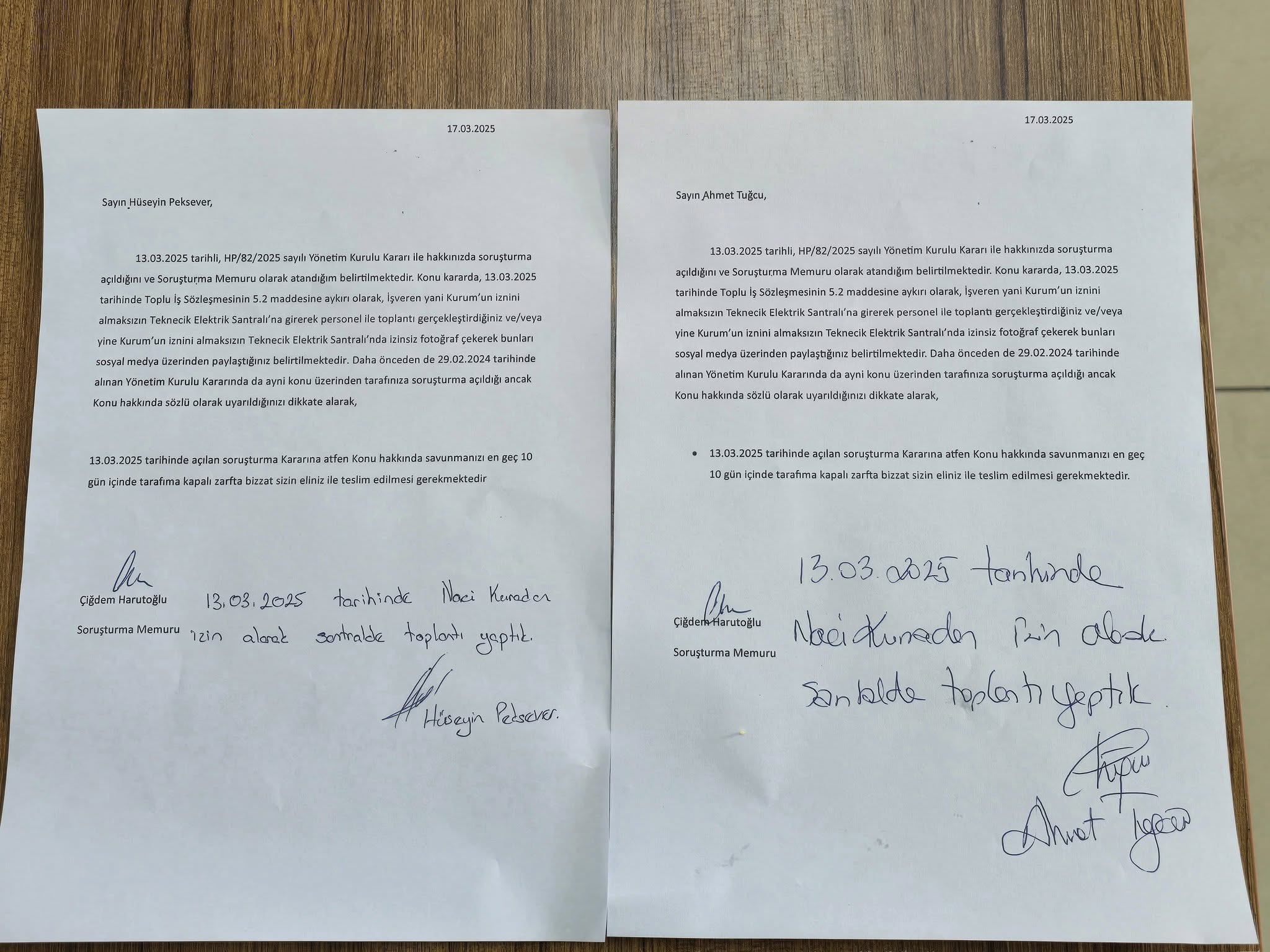 Sendikacılara gönderilen yazıda ise “Kurum’un iznini almaksızın Teknecik Elektrik Santrali’ne girerek personel ile toplantı gerçekleştirdiğiniz ve/veya yine Kurum’dan izni almaksızın Teknecik Elektrik Santrali’nde izinsiz fotoğraf çekerek bunları sosyal medyada paylaştığınız belirtilmektedir” deniliyor. Yazıda, daha önce bu konuda sözlü olarak uyarıldıklarına yer verilirken, sendikacılardan 10 gün içinde savunma istendi. Oldukça sert üslup kullanılan yazıda, aynen “Konu hakkında savunmanızı en geç 10 gün içinde tarafıma kapalı zarfta bizzat sizin eliniz ile teslim edilmesi gerekmektedir” ifadeleri kullanılırken, sendikacıların; yazının altına, izin aldıkları kişinin adını yazarak imzaladıkları dikkati çekti.