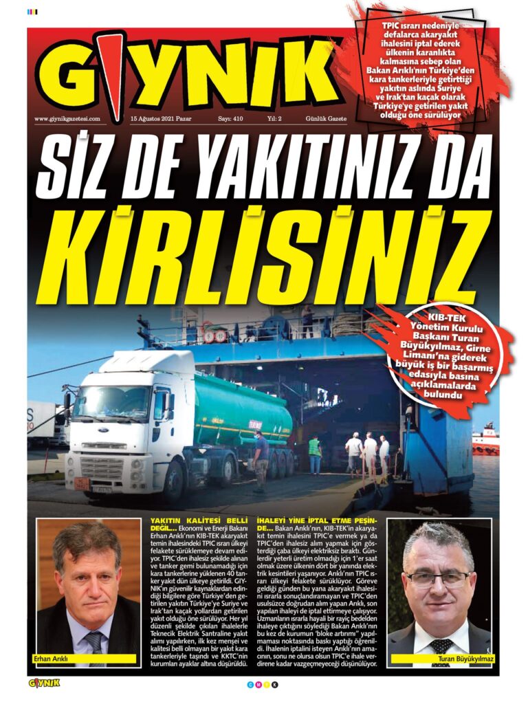 GIYNIK Gazetesi’nin defalarca manşetine taşıdığı KIB-TEK akaryakıt konusunda GIYNIK Gazetesi’nin manşetlerini doğrular nitelikte gelişmeler yaşanmaya devam ediyor. Uzun süreden beridir ülkeye 28 doların altında fuel-oil yakıt getirilebileceği iddiasıyla, hiçbir bilimsel dayanağı olmadan KIB-TEK akaryakıt temin ihalesinin rayiç bedelini de kendi kafasına göre belirlediği ton başına 28 dolar üzerinden açan Ekonomi ve Enerji Bakanı Erhan Arıklı, 9 aydır oyaladığı ve iptal ettiği ihaleler nedeniyle Teknecik Elektrik Santrali’ni yakıtsız bıraktı. Yakıtsız bırakılan Teknecik Elektrik Santrali’ne doğrudan alım şeklinde TPIC’den yakıt temin eden ve bu yakıtı da ton başına 36 dolar fiyattan temin eden Erhan Arıklı ve Arıklı’nın KIB-TEK şürekası, ülkeye getirilen yakıtın kalitesi ve menşeiyle ilgili bilgi vermekten ve açıklama yapmaktan kaçınıyor. Ülkeye getirilen ne idüğü belirsiz ve kalitesiz yakıtlar nedeniyle Teknecik Elektrik Santrali’nin bacaları zehirli duman saçmaya devam ediyor.